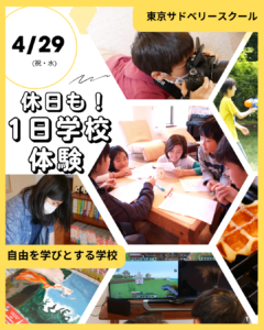 サドベリースクールをプチ体験しませんか?生徒の様子をご覧いただいたり、お子様が生徒と一緒に過ごせる時間、学校説明等選べます。親御さんのみも歓迎!
